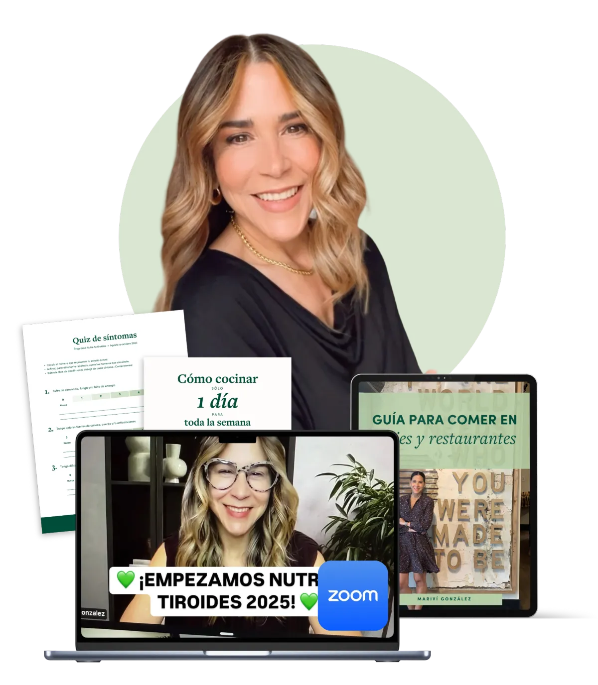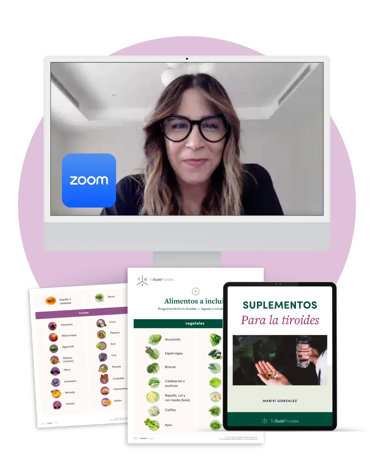 Nutre tu tiroides es un programa virtual grupal de 7 semanas que incluye clases en vivo conmigo cada semana, seguidas de sesiones de preguntas y respuestas para resolver tus dudas en tiempo real. Tendrás acceso a una plataforma privada donde encontrarás siete módulos con materiales descargables, menús semanales, recetarios, listas de compras, plantillas de planificación y guías detalladas para acompañarte paso a paso. Durante dos meses estarás acompañada en un grupo exclusivo de Whatsapp donde mi equipo y yo te damos seguimiento y apoyo personalizado. En este grupo cuentas con el apoyo de nuestra nutricionista, que está disponible para responder dudas más específicas. Si no puedes asistir a las sesiones en vivo, no te preocupes: todas las clases quedan grabadas para que las veas cuando quieras. Además, recibirás bonos especiales como un menú de postres saludables, un menú de vegetales y ensaladas, una guía de suplementos generales para la tiroides, y si haces tu compra rápida, también obtienes una sesión personalizada uno a uno conmigo.